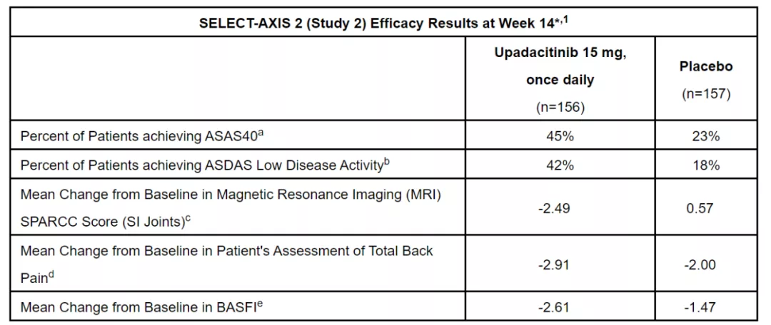 兩項3期臨床試驗結果表明,在第14周時,無論在非放射學中軸型脊柱關節炎(nr-axSpA)患者,或在生物制品治療效果不佳的活動性強直性脊柱炎(AS)的患者中,與安慰劑相比,烏帕替尼組更多患者達到國際脊柱關節炎協會(ASAS)40應答?;颊甙Y狀獲得統計學顯著的減輕,包括背痛和炎癥,以及身體功能和疾病活動度的改善。中軸型脊柱關節炎是一種累及脊柱的慢性炎癥性疾病,會引起背痛、活動受限和結構損傷。